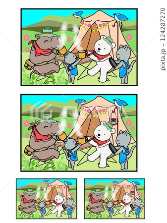 間違い探しクイズ かわいい動物たちのイラスト テーマ:キャンプ場