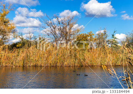 View of a bay surrounded by reed beds, a flock of Eurasian coots swimming calmly in the water, walks in an autumn forest, changing seasons in nature