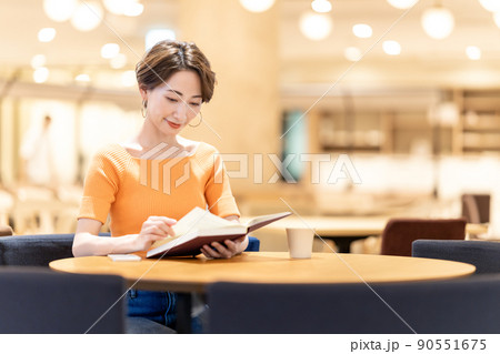 カフェで読書するミドルの女性