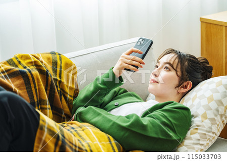自宅のソファーでスマホを見る女性