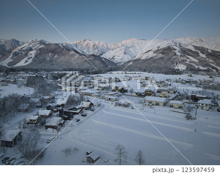 美しい五竜岳と唐松岳のモルゲンロートと白馬村の街並み 長野県白馬村(ドローンによる空撮)