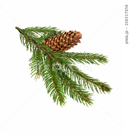 Christmas tree branch and cone. Xmas spruce. Green fir pine twig. Pine cone on branch with needle. Pine tree branch. Needle of a coniferous tree. Pine pollen. Needle of Christmas tree.