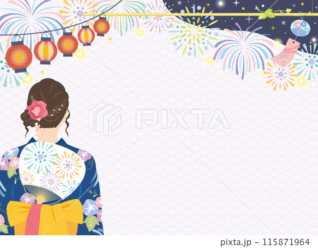 浴衣姿の女性と夏祭りの背景イメージ 花火 横