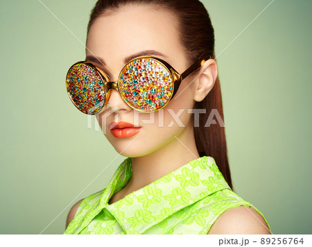 Portrait of beautiful young woman with colored glasses
