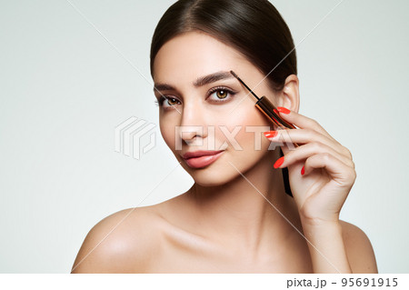 Beautiful woman puts mascara on her eyebrows