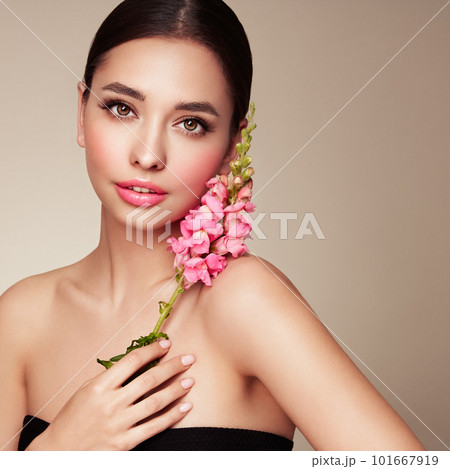 Beautiful young woman with a pink larkspur flower