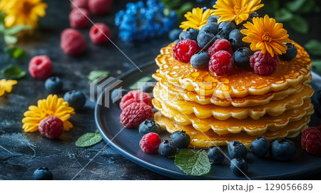 Lush, golden pancakes stacked on top of each other, decorated with fresh raspberries, blueberries, and blackberries, and topped with bright yellow flowers.