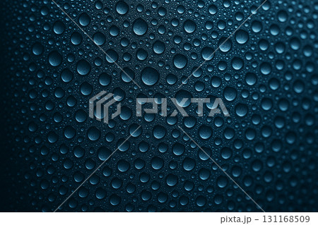 Top view of macro close up of blue water droplets densely covering a textured background under even lighting. Droplets concept.
