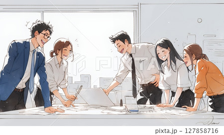 オフィスで立ったまま簡単な打合せをしているビジネスパーソン