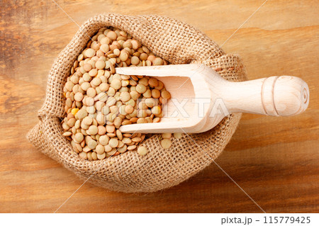 Brown raw dry lentils in rustic bag on rustic wood table