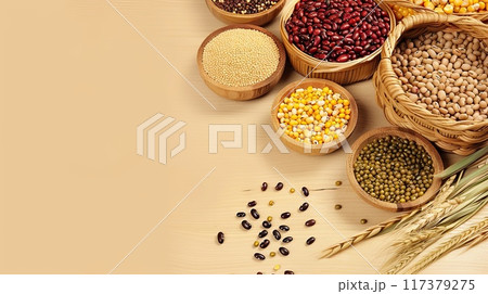 An assortment of grains and legumes, including beans, corn, and quinoa, displayed in wooden bowls on a wooden surface with wheat stalks..