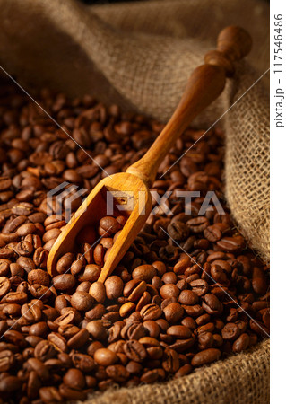 Roasted coffee beans in burlap bag.