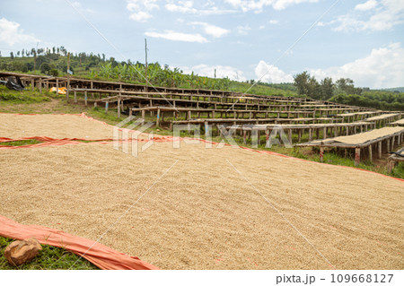 Coffee beans in the process of drying on the ground and special structures