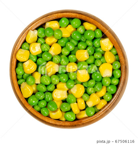 Green peas and corn in wooden bowl. Mixed vegetables. Seeds of pod fruit Pisum sativum and blanched yellow vegetable maize, Zea mays, also called sugar or pole corn. Closeup, from above, food photo.