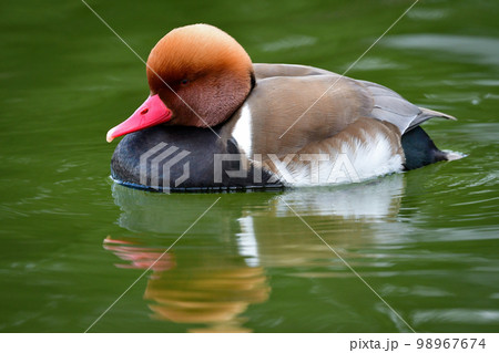 オレンジの頭、赤い嘴、黒い旨が目立つ珍しい冬の渡り鳥、アカハシハジロ