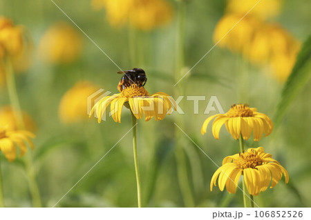 ヒメヒマワリの花粉を集めるクロマルハナバチ