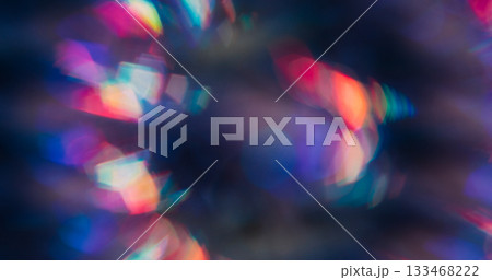 Blur reflection lens. Neon light leak. Color defocused kaleidoscope flash. Purple blue red spectrum sphere on dark abstract background.