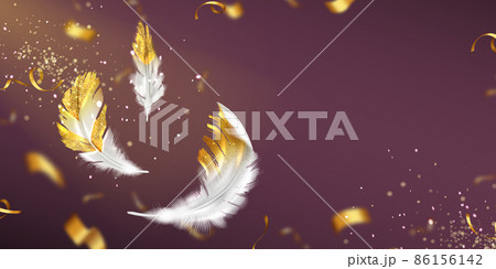 Fluff feathers. Realistic angel wings feather flow, falling bird plumage, fluffy swan or dove 3d twirled feathers vector background illustration