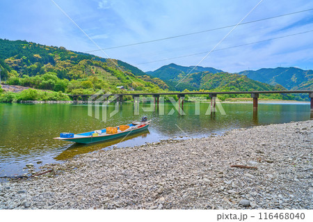 高知県四万十市の四万十川に架かる三里橋(三里沈下橋)を河川敷から小船と共に見る