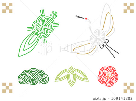 手書きの可愛い水引のイラストセット 縁起物 鶴亀 松竹梅