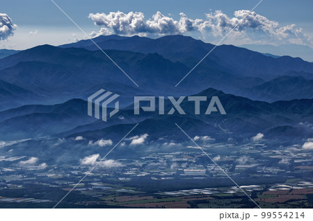 八ヶ岳連峰・硫黄岳から見る朝もやに浮かぶ金峰山と大菩薩の山並み