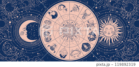 Astrology chart with 12 zodiac signs, sun and moon. Zodiac wheel on starry sky background, mystical vector banner.