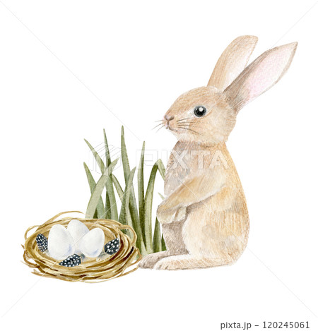 Watercolor composition with Easter bunny, nest with egs and feathers in grass. Great for happy Easter