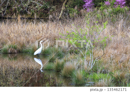 早春景色の溜池に佇む白鷺