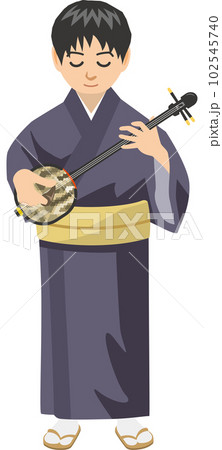 さんしんを立って弾いている若い男性のイメージイラスト(地謡)