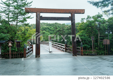 雨の伊勢神宮 内宮の宇治橋と宇治橋鳥居