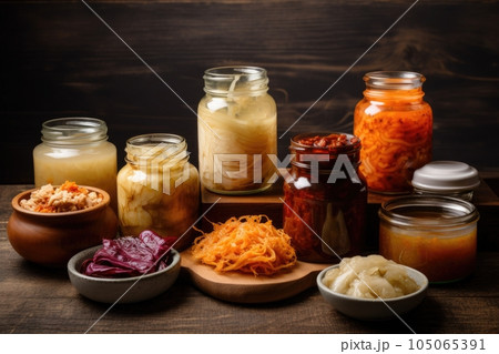 a variety of fermented foods, including sauerkraut, kimchi, and miso, created with generative ai