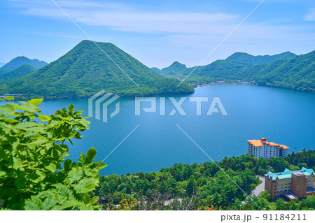 群馬県 榛名湖西側にある硯岩(すずりいわ)からの眺望(榛名湖,天目山など)