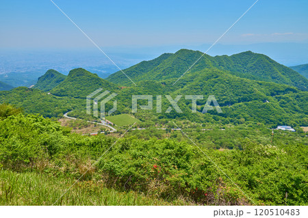 群馬県高崎市の春の榛名山ロープウェイの榛名富士山頂駅から南側の三ッ峰山方面を見る