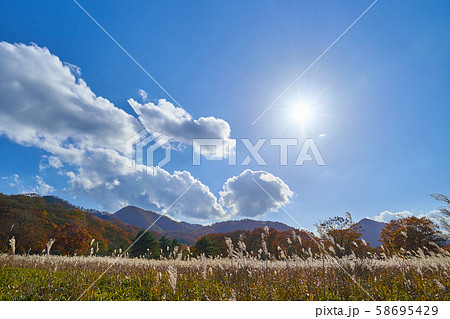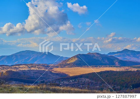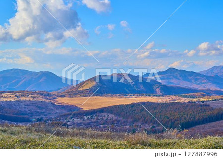秋の長野県諏訪市 車山肩のビーナスの丘付近から北西側の眺望(鷲ヶ峰,八島ヶ原湿原,二ツ山など)