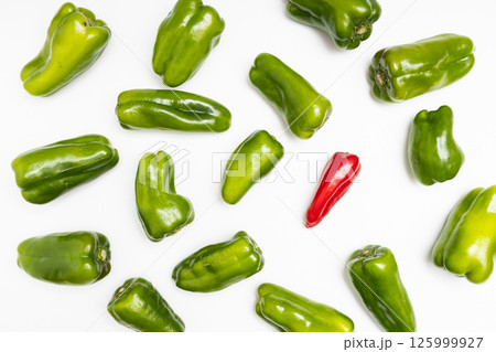 ピーマンの素材写真 赤いピーマンが緑に囲まれている