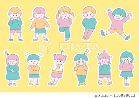 いろいろパステルカラーの子供たちの全身イラスト 白ふちあり