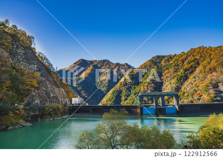 豊根村の新豊根ダムの紅葉する山肌の風景(愛知県)