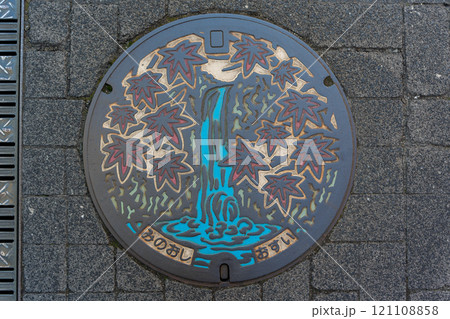 大阪府箕面市のマンホール 箕面大滝と紅葉デザイン