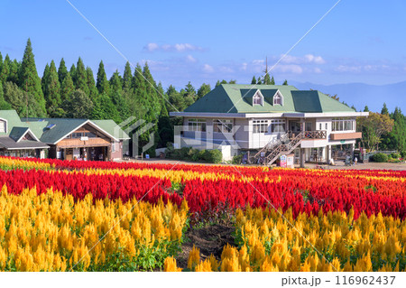 みはらしの丘に咲き乱れる セロシア(ケイトウ属)とケイトウの花 風景「くじゅう花公園」大分県竹田市