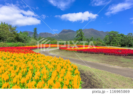 くじゅう連山を背景に美しい秋の花風景 セロシア・ケイトウの花 風景「くじゅう花公園」大分県竹田市