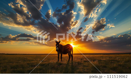 Golden Serenity: A Donkey's Journey Beneath the Sunset Sky. Generative AI