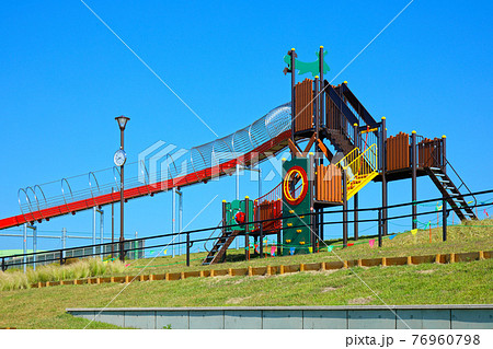 梅雨の谷間の新宮前公園の滑り台と広場