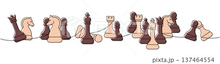 Modern continuous line art with chess pieces queen, pawn, knight, rook, king in a flowing minimalist composition