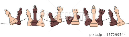 Modern continuous line art with chess pieces queen, pawn, knight, rook, king in a flowing minimalist composition