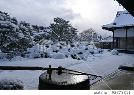 冬の朝の京都市岩倉 妙満寺 雪の庭と蹲