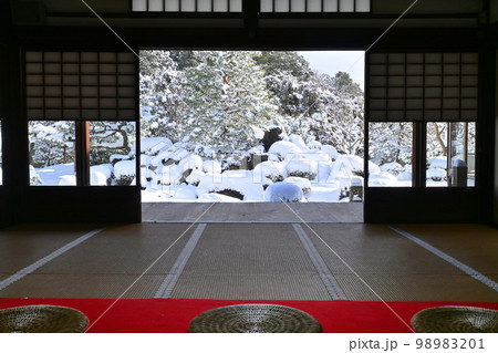 1月の朝に座禅する京都市岩倉 妙満寺の雪の庭