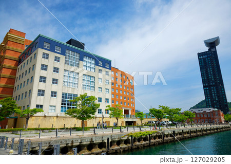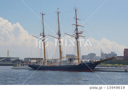 門司港レトロ展望室と岸壁に停泊中の船舶 帆船など