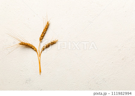 Sheaf of wheat ears close up and seeds on colored background. Natural cereal plant, harvest time concept. Top view, flat lay with copy space. world wheat crisis