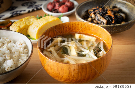 和食 麦飯とみそ汁 おかず 食卓 朝食