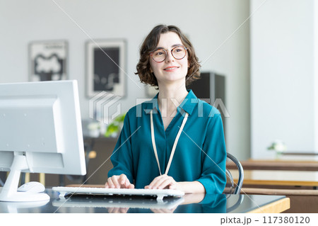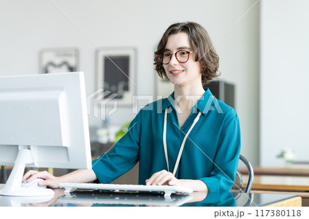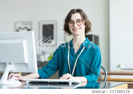 オフィスでノートパソコンを使う眼鏡の若い女性